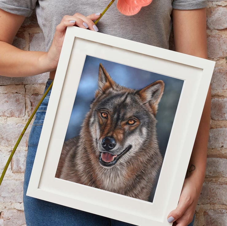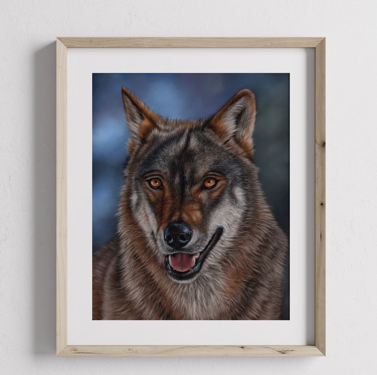 "Silent Wilderness". Wolves are one of the most mysterious and captivating of animals. They are such a wonderful challenge for an artist and I always enjoy drawing and painting them. This artwork shows a magnificent wolf in fine detail and rich colour. I wanted the focus to be on the enchanting orange eyes.