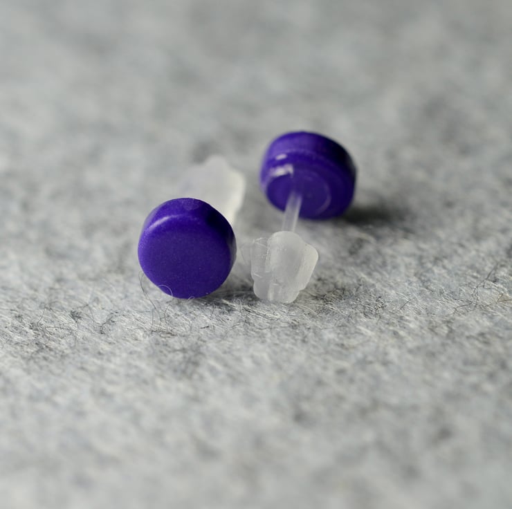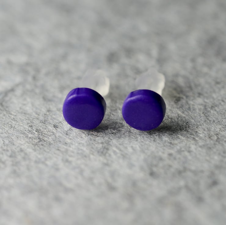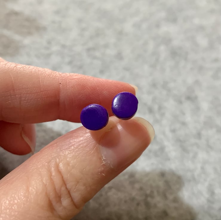 A pair of small earrings made from polymer clay, and on plastic posts.
