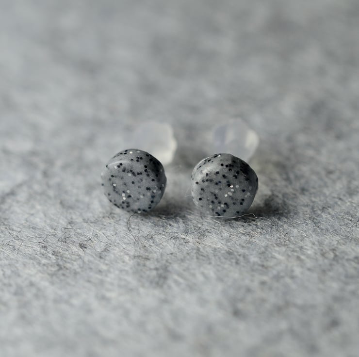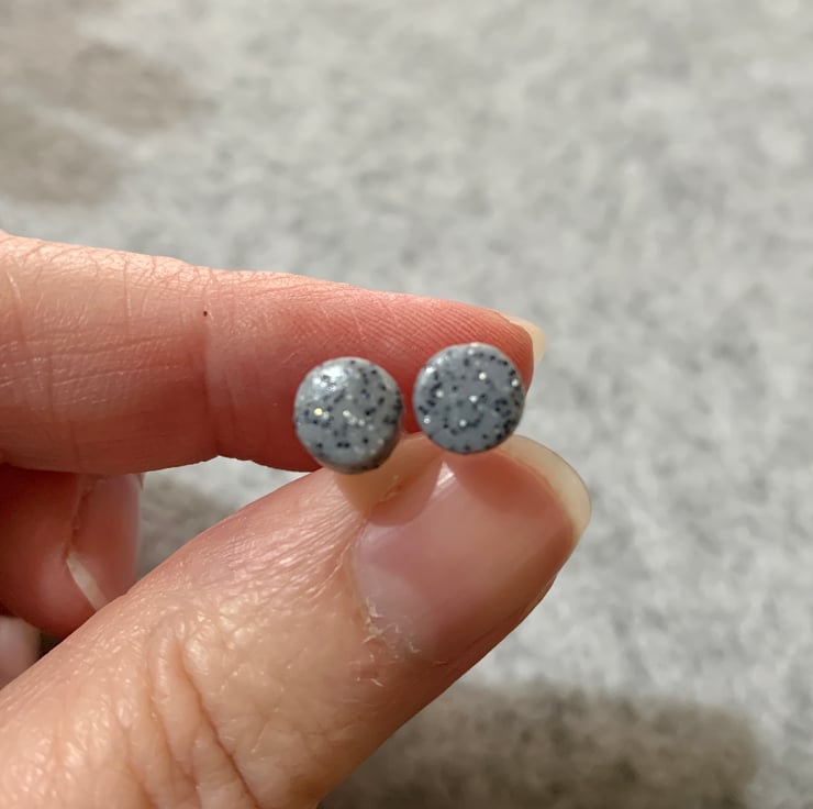 A pair of small earrings made from polymer clay, and on plastic posts.