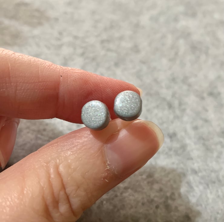 A pair of small earrings made from polymer clay, and on plastic posts.