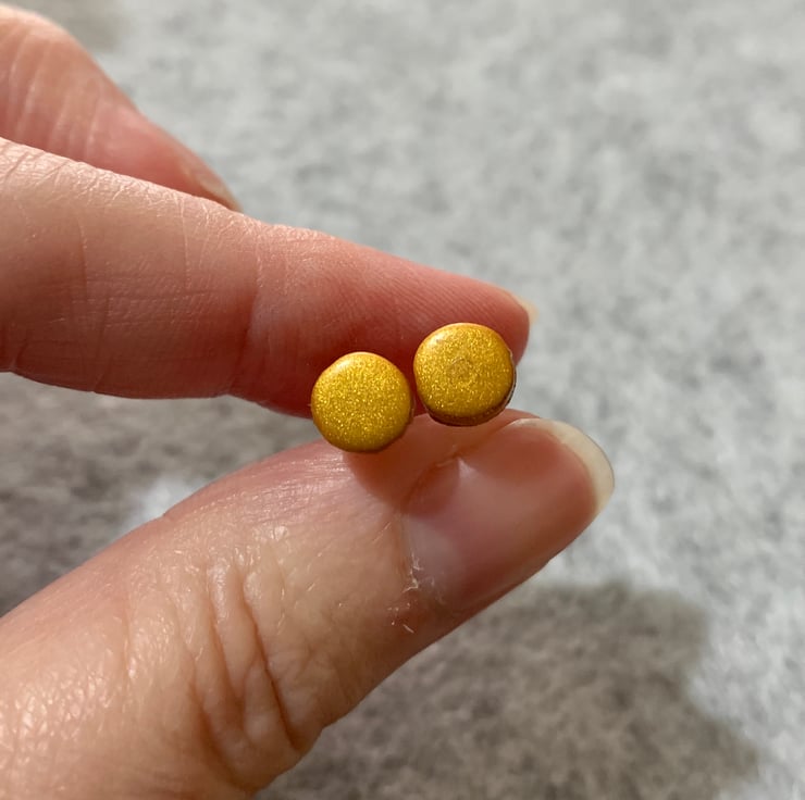 A pair of small earrings made from polymer clay, and on plastic posts.