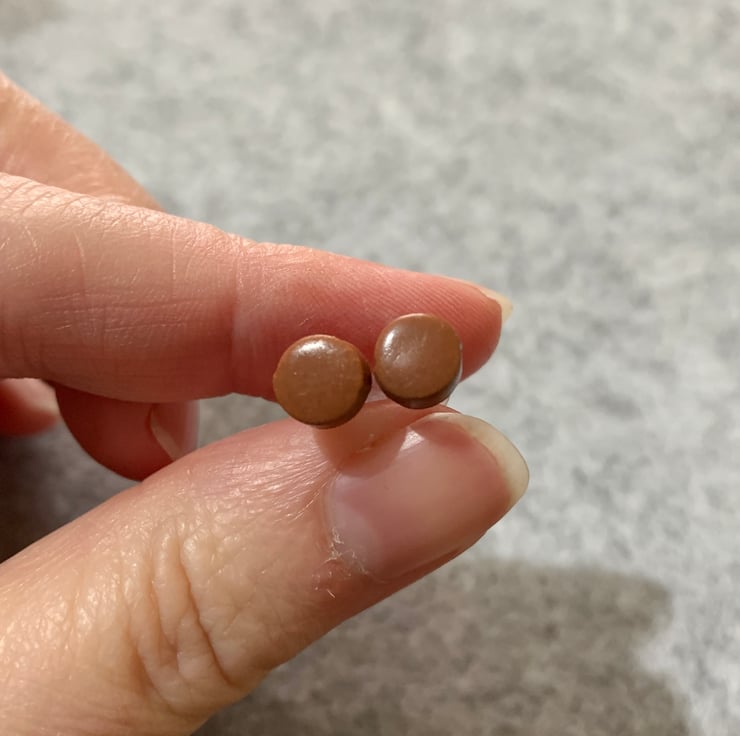 A pair of small earrings made from polymer clay, and on plastic posts.