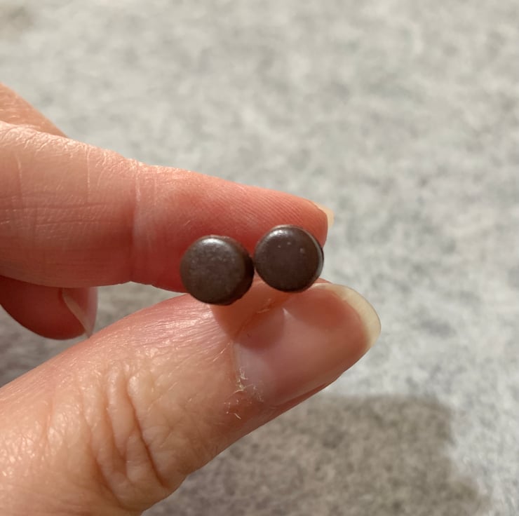 A pair of small earrings made from polymer clay, and on plastic posts.
