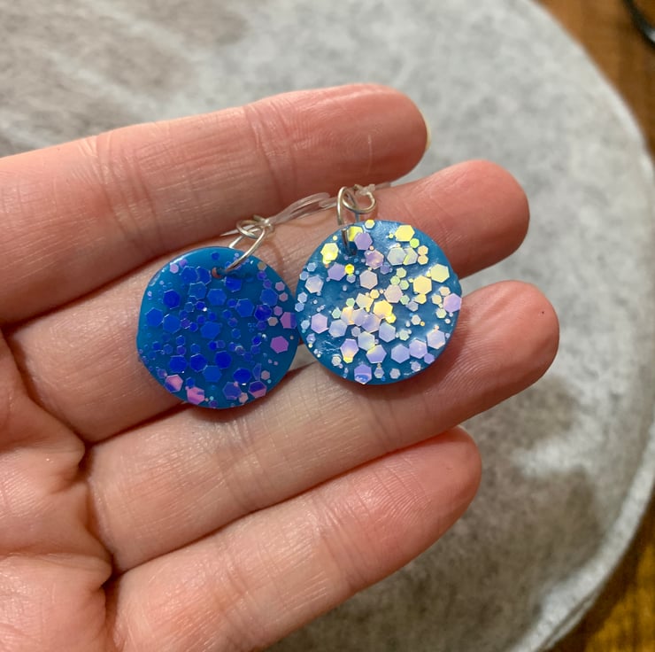 These earrings are approximately 2cm in diameter and made from polymer clay with glitter varnished on top.