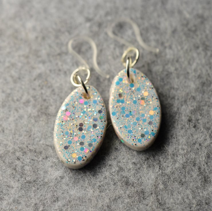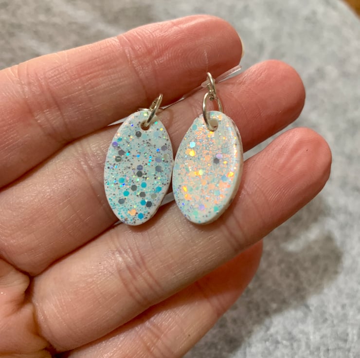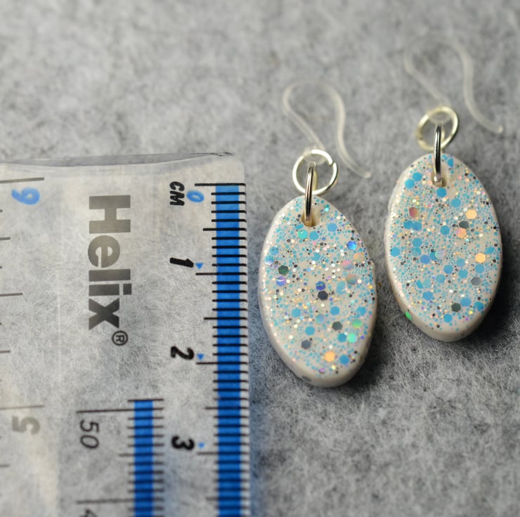 These earrings are approximately 2.5cm in diameter and made from polymer clay with glitter varnished on top.