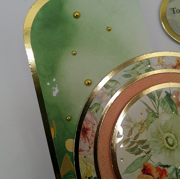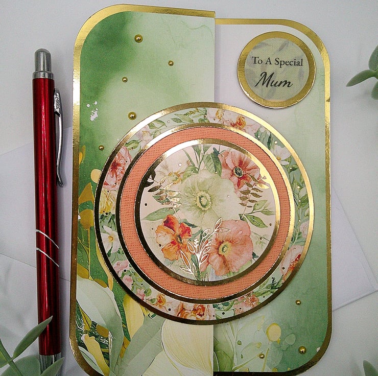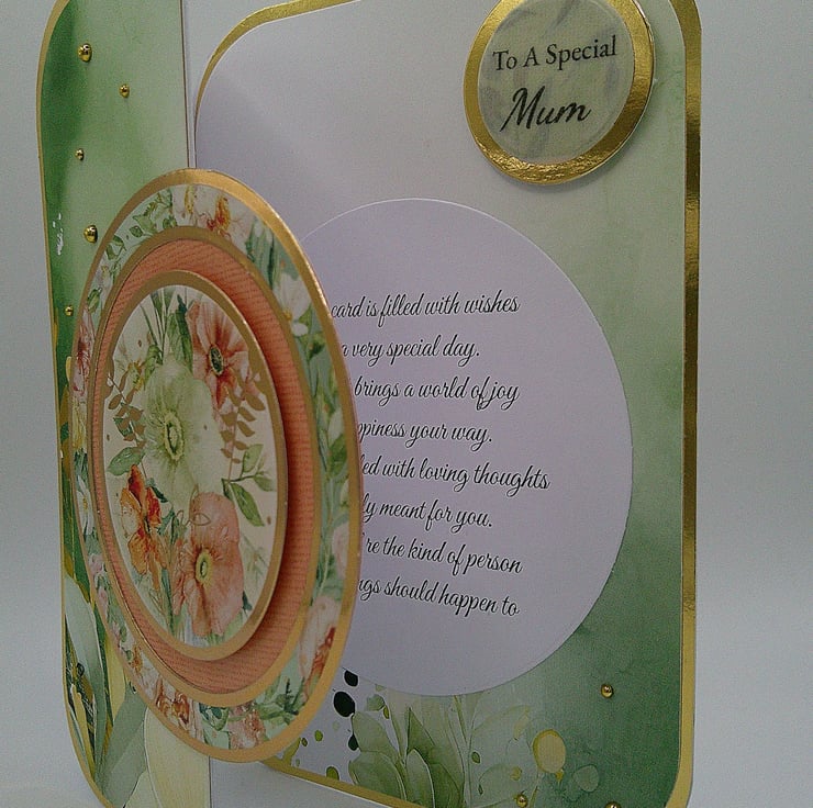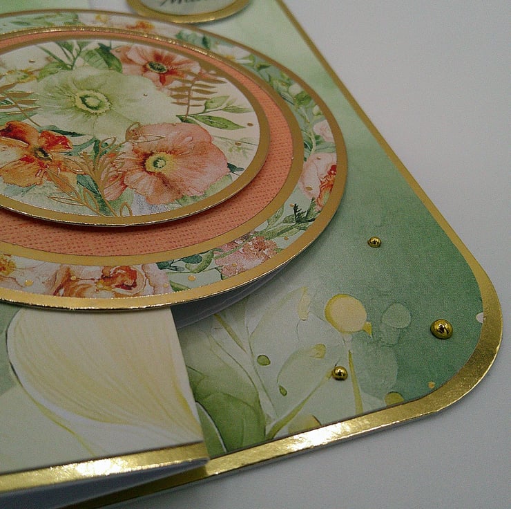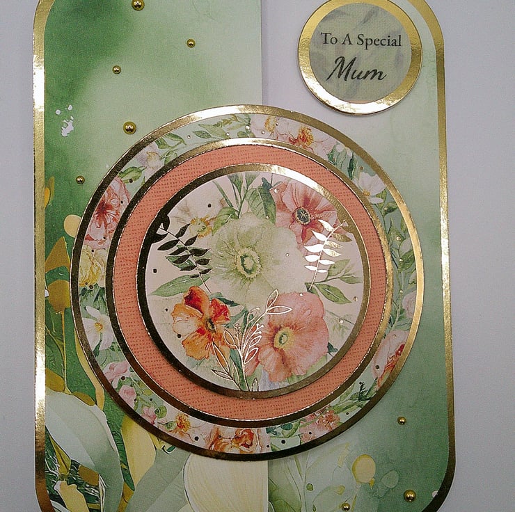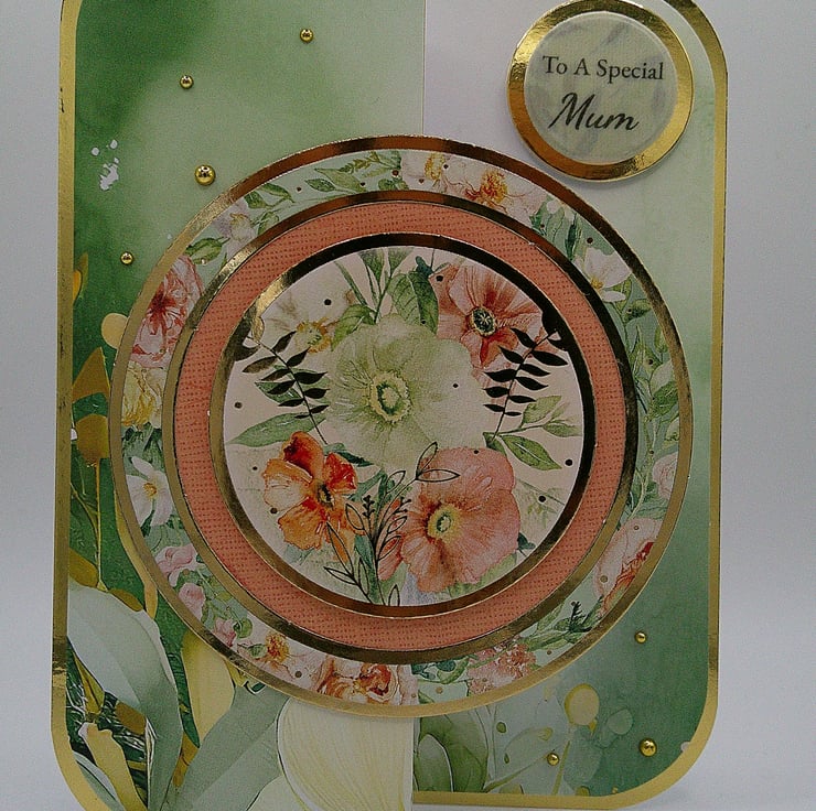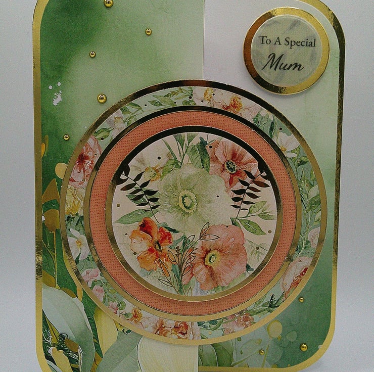A luxury handcrafted fold back card featuring spring style flowers and foliage in sage green, peach and soft pink tones, together with gold accents and embellishments. (Our mothers deserve the luxury).