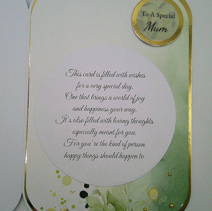 The sentiment on the inside of the card reads "This card is filled with wishes, for a very special day. One that brings a world of joy and happiness your way. It's also filled with loving thoughts especially for you, for you're the kind of person happy things should happen to"