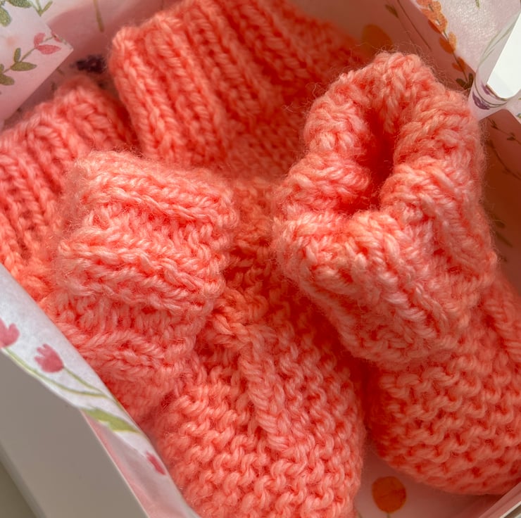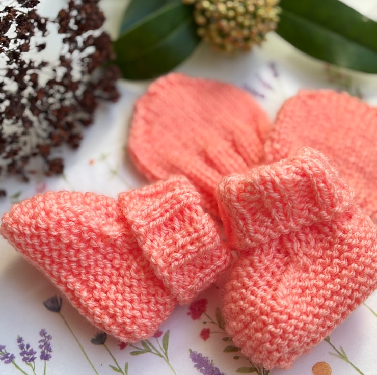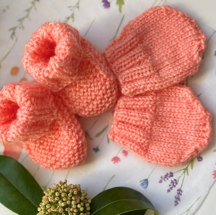 Peach colour gift set containing baby booties and scratch mittens to keep baby from scratching face and keeping warm at night.