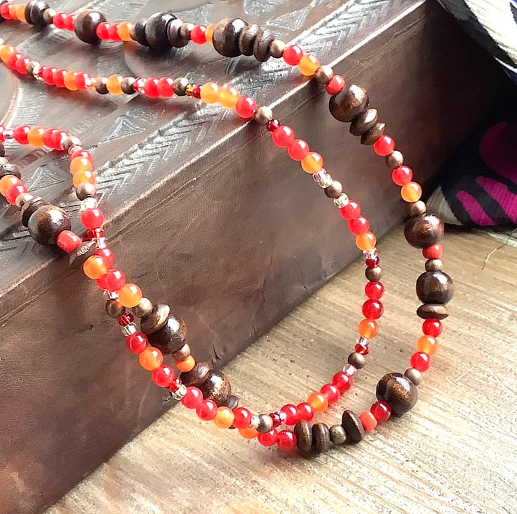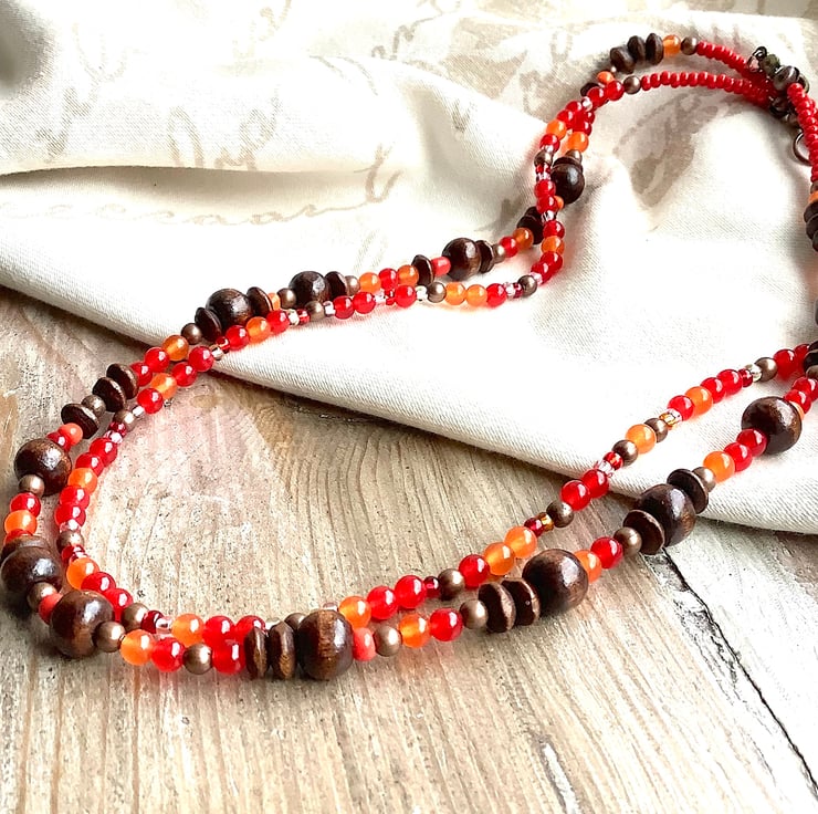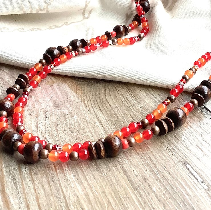Boho, cottage core earthy 2 strand necklace. Red and Orange jade teamed with metal, wooden and acrylic beads. Bright orange and dark brown colours. Necklace length 47 cm