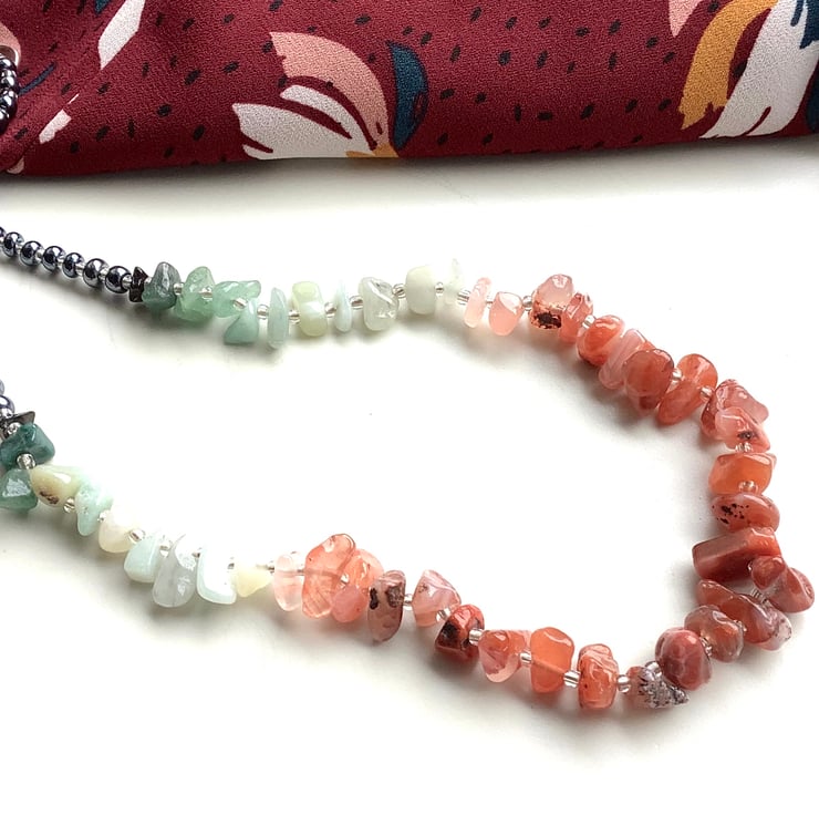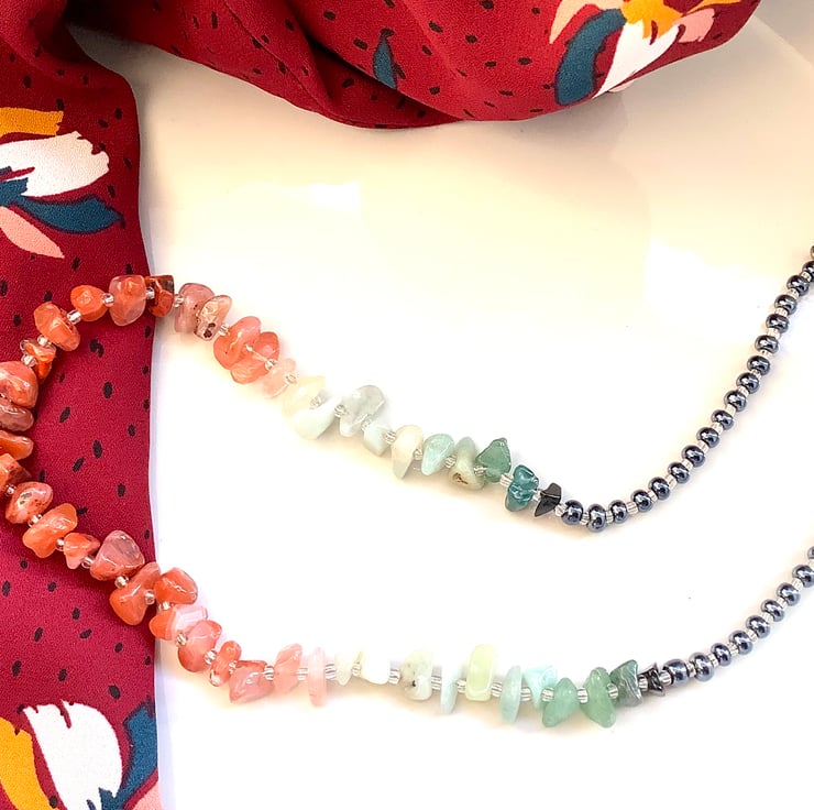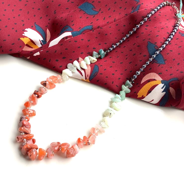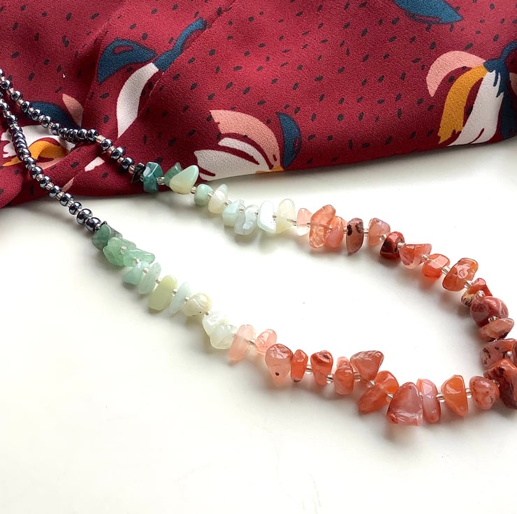 Gemstone chips necklace made with natural Carnelian and Amazonite. Graduating colours from deep orange in the centre moving to pale sea green and on to a dark blue. Gorgeous boho chic, rustic, beach summer necklace. 42 cm length