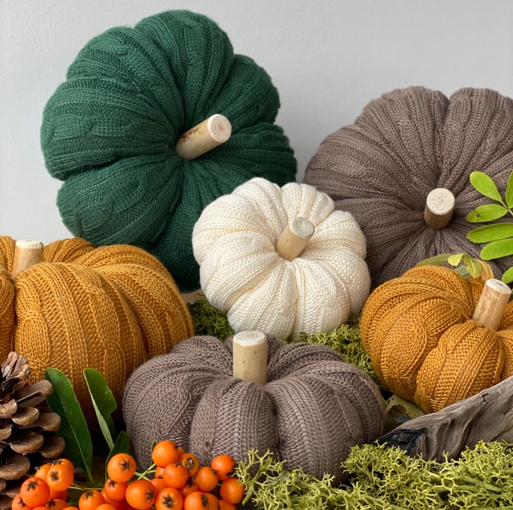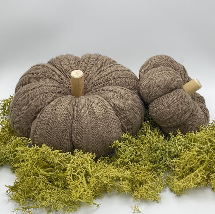Embrace the rich, earthy tones of fall with these stunning knit pumpkins in a soothing taupe/brown color palette. Perfect for adding a cozy, rustic touch to your home, these pumpkins are ideal for creating an inviting atmosphere. Place them on your tabletop, mantel, or as part of a seasonal arrangement, and let them bring a sense of warmth and comfort to your space. The woven cable knit fabric creates a beautifully textured look, while the driftwood stems add a natural, organic element that enhances the fall charm.