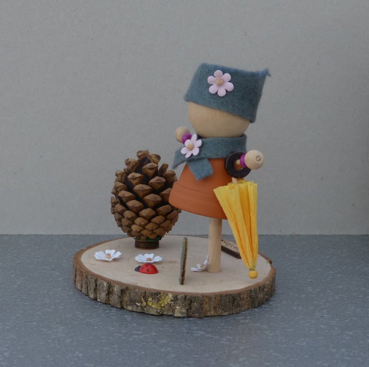 A small diorama of a well dressed Flowerpot friend who likes to think she can predict the weather but always brings an umbrella, just in case.