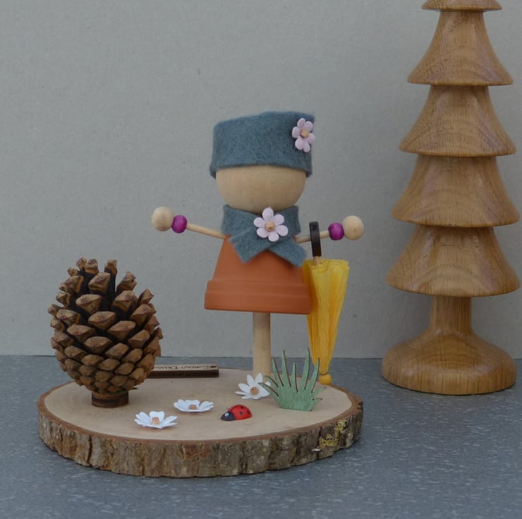 In a fetching grey felt hat and matching scarf, this terracotta flowerpot friend also comes with a handmade paper umbrella and a natural pine cone.
