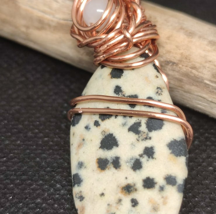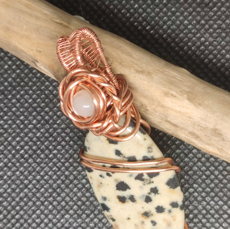 This beautiful Dalmatian Jasper pendant, with rose quartz beading is wrapped in anti-tarnish copper wire in a simple but elegant design.