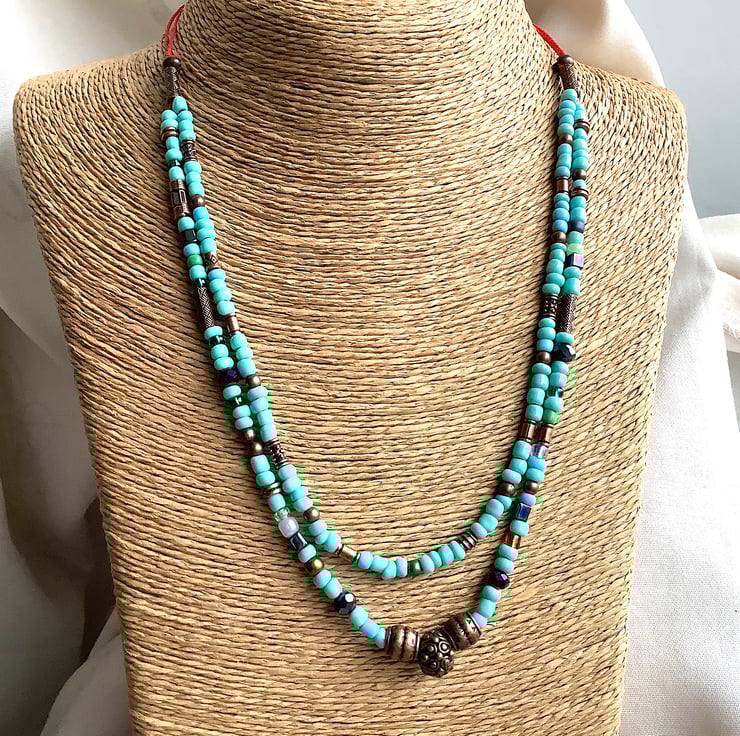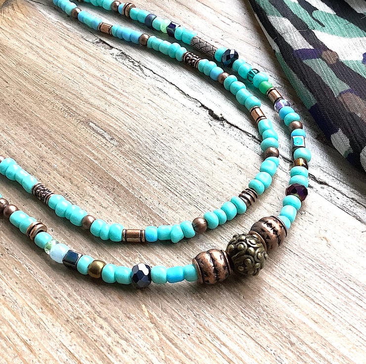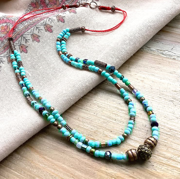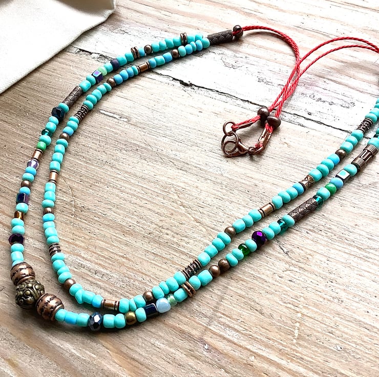 A gorgeous turquoise effect necklace with a touch of boho rustic copper colour spacer beads. New and old up cycled beads used to make this pretty listing. Red orange string and brass effect clasp. Length: inner strand 48 cm; outer strand 51 cm