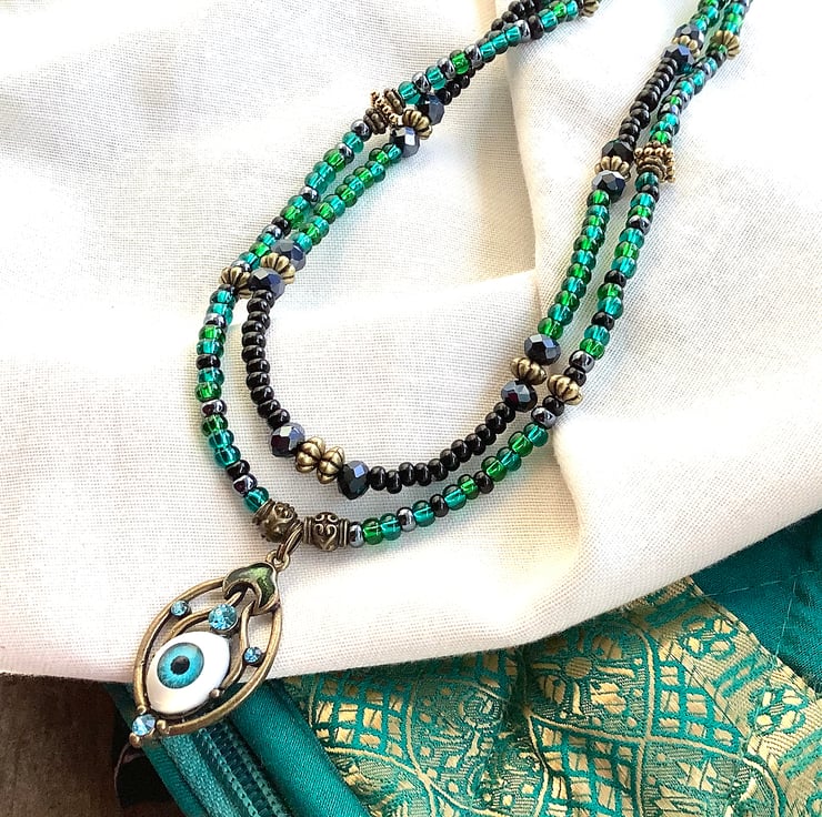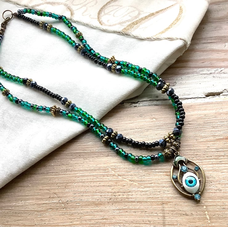 Double strand necklace: Eye pendant, turquoise and copper effect beads, acrylic and metal beads