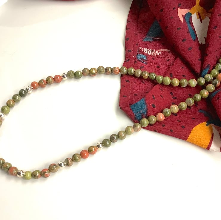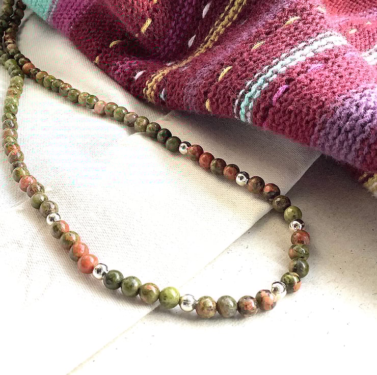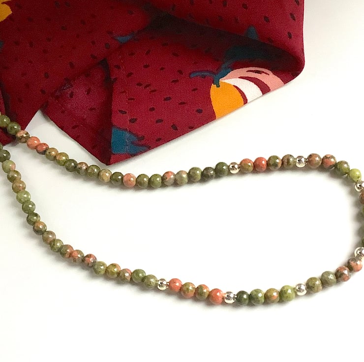 Single strand necklace, pink, coral colour and earthy moss green Unakite