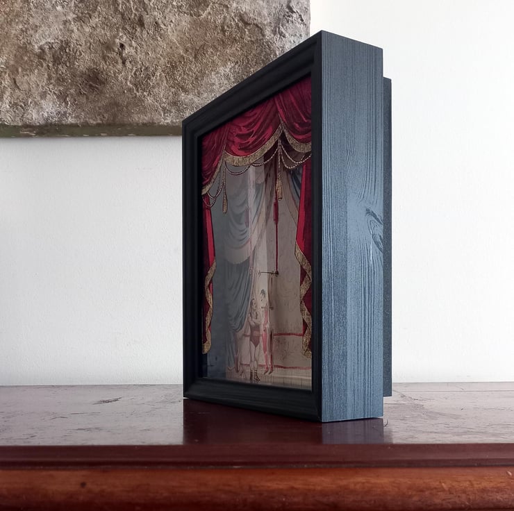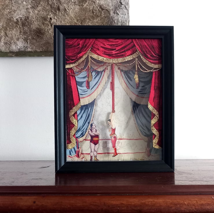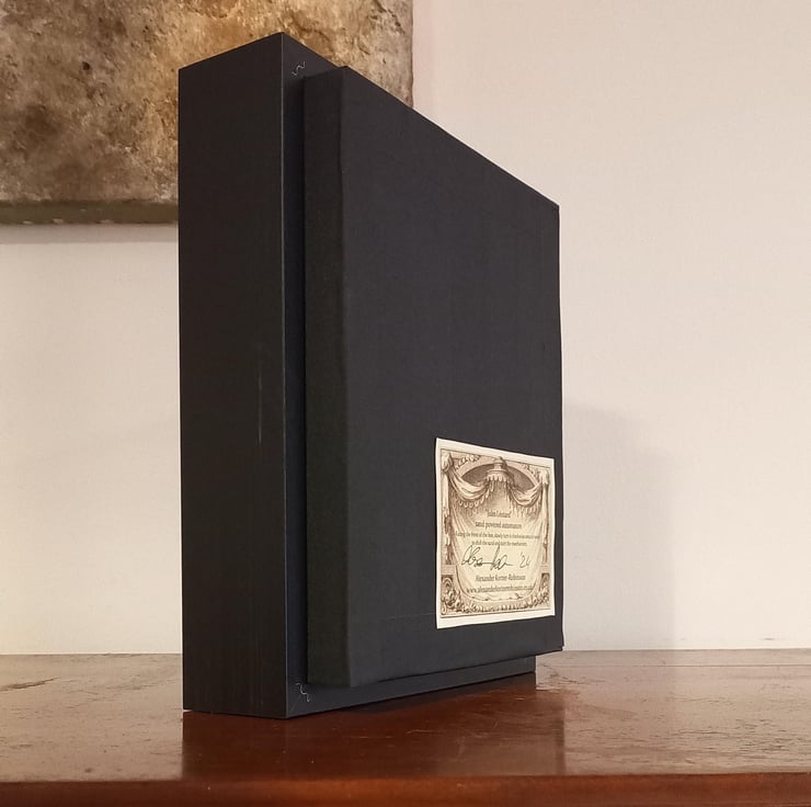 This is a sand-powered automaton based on a Victorian toy. The acrobat is moved by sand inside the box that trickles down over a paddle wheel moving the figure backwards and forwards at random. No Batteries required. The mechanism is started by turning the box clockwise once, which fills a funnel inside the box with sand. While the funnel slowly empties itself, the acrobat performs his tricks.