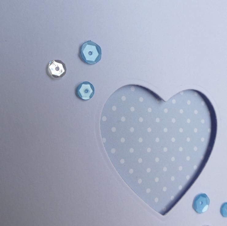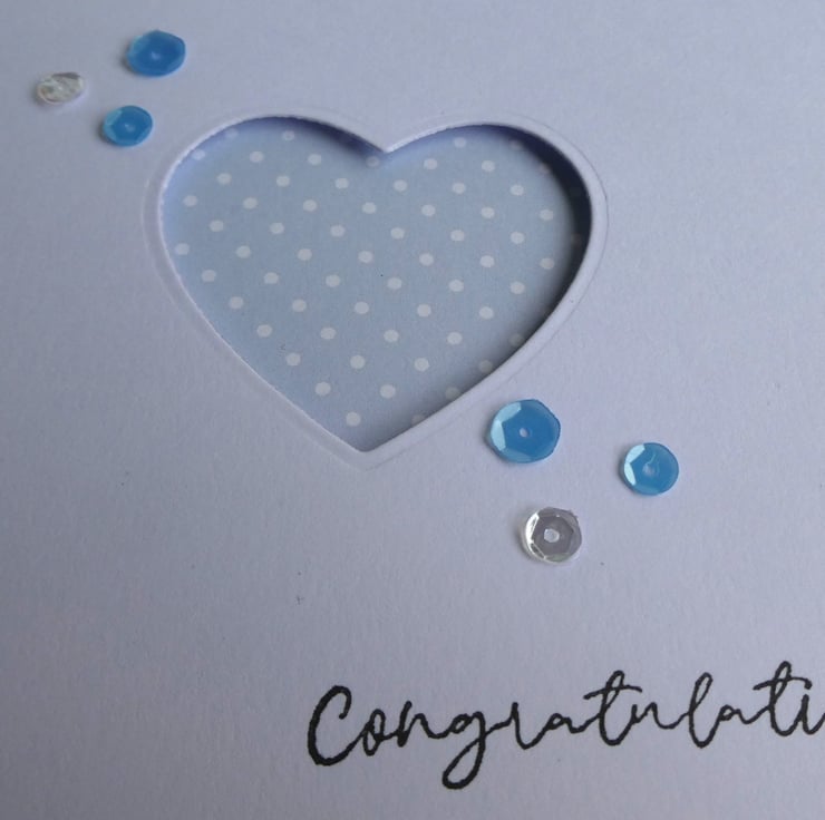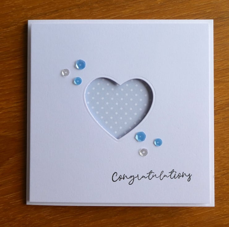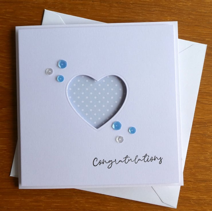This simple and elegant congratulations card has a pastel blue and white polka dot background which can be seen through a heart shaped aperture. It could be sent as a new baby, new job, engagement or anniversary card or to send congratulations on many other occasions or as a birthday card.