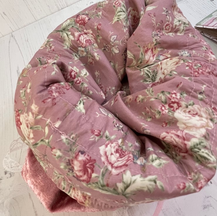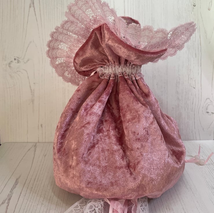 Crushed velvet drawstring bag, decorated with lace and lined with a vintage style Rose and Hubble Rose fabric. Measures: 9.5" diameter 6". Lace dangle to the base with a rose in the middle top.
