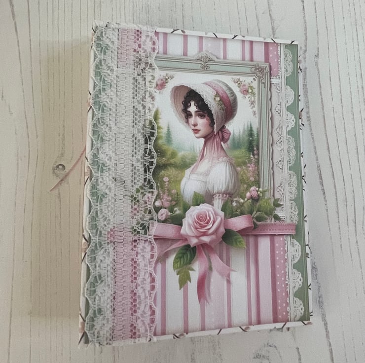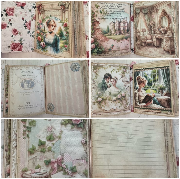 80 pages featuring the story of 'Emma' by Jane Austen. Hard cover, hand bound and hand stitched pages. Lace to embellish. Measures 5.5" x 4" x 1.75".