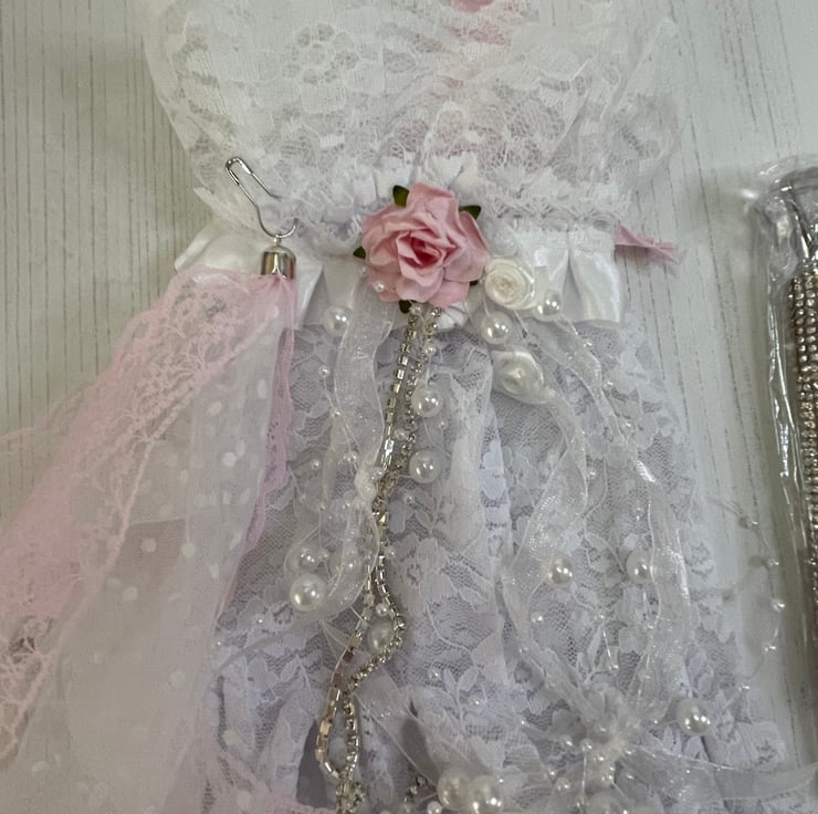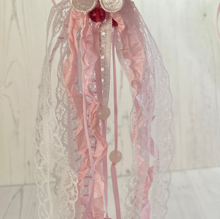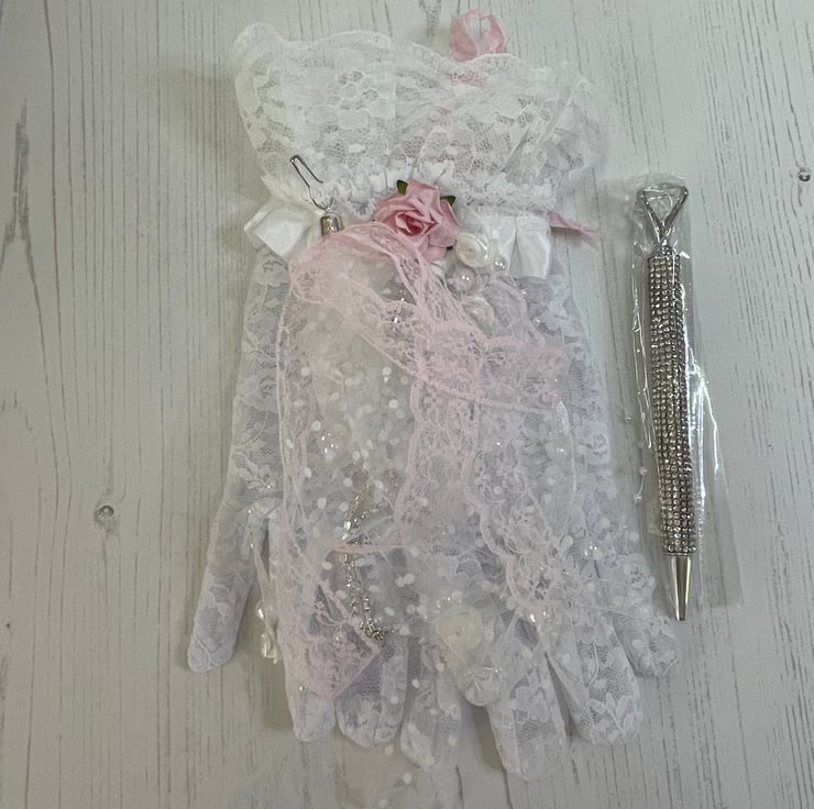 Lace gloves stitched together with a ribbon hanging loop, decorated with white ruffle ribbon, lace dangle held by a silver bulb pin. roses and bead trim with a paper rose to the centre. Measure 10"