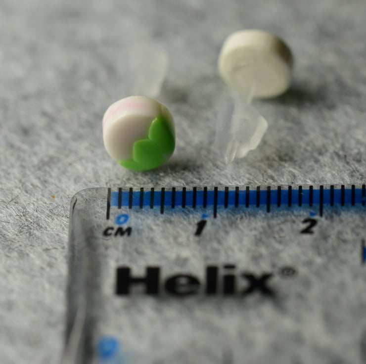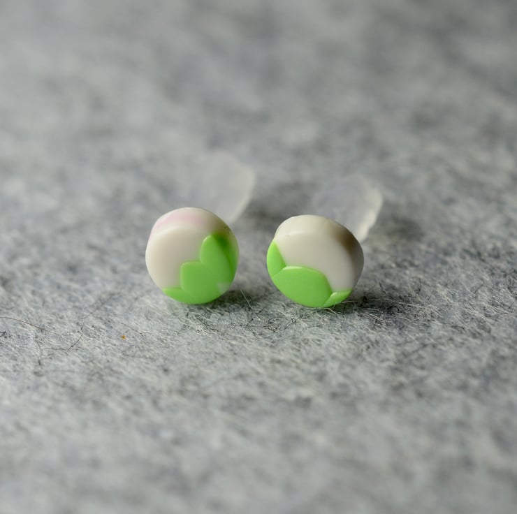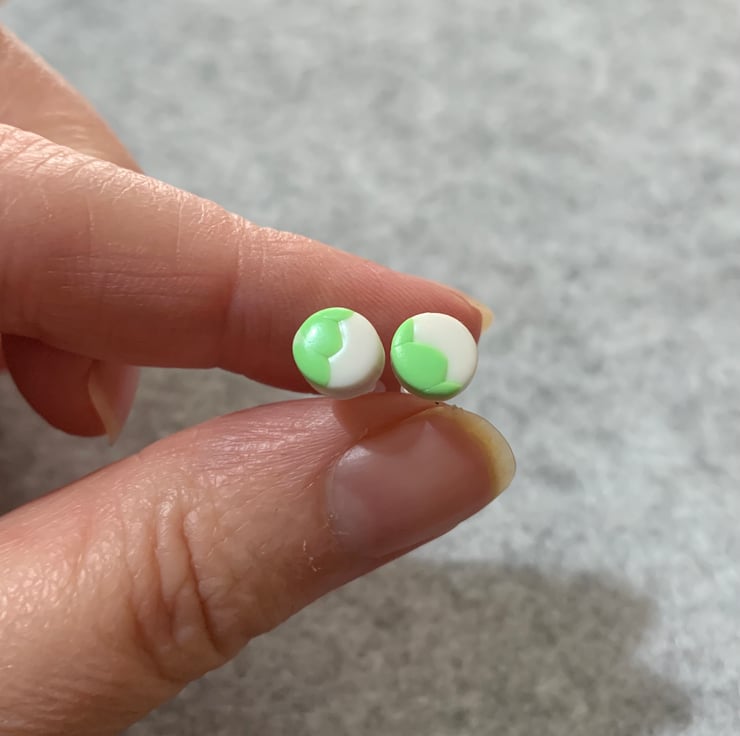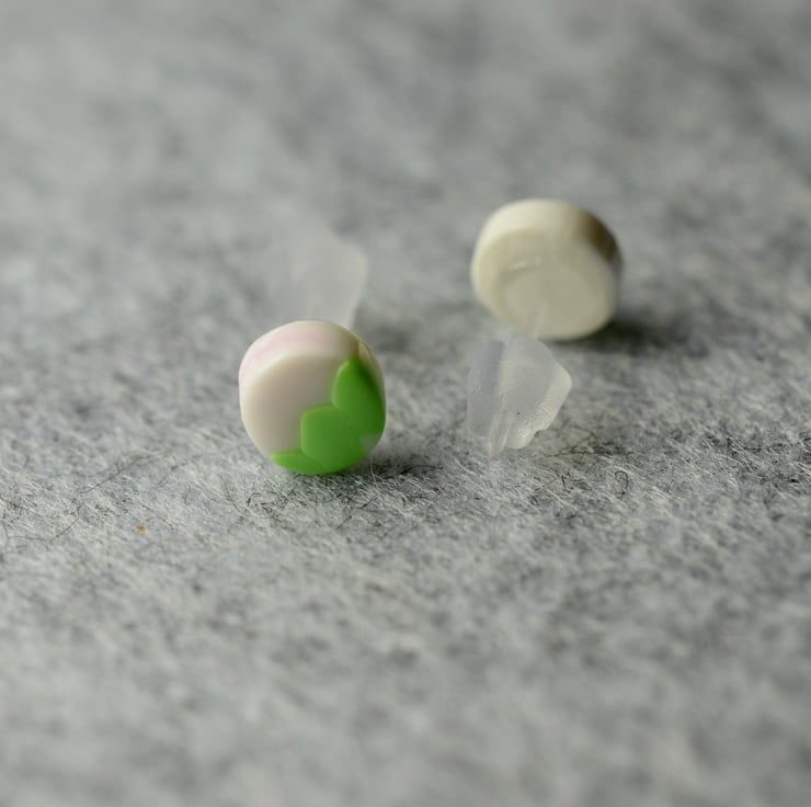A pair of small earrings made from polymer clay, and on plastic posts.