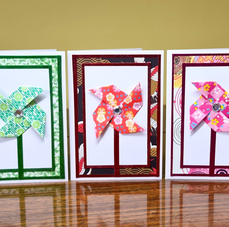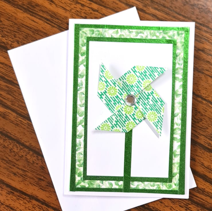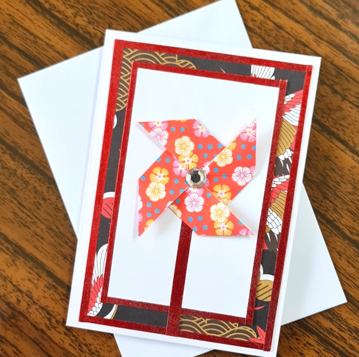 A handmade origami A6 greeting card with a blank inside. An origami pinwheel in the centre with a decorative border around it. Comes with a blank white envelope in a sealed plastic sleeve.