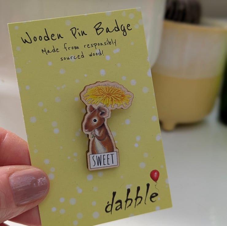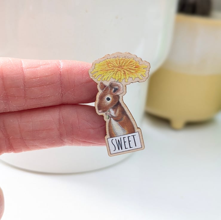 When you're small you get a different perspective on the world, such as being able to shelter under a pretty dandelion. This sweet mouse brooch is made from sustainable wood. It should look cute on your denim or cotton jacket, or on your lanyard and show your inner personality. A great gift for friends and loved ones that have a warm glow in their heart and a smile on their face.
