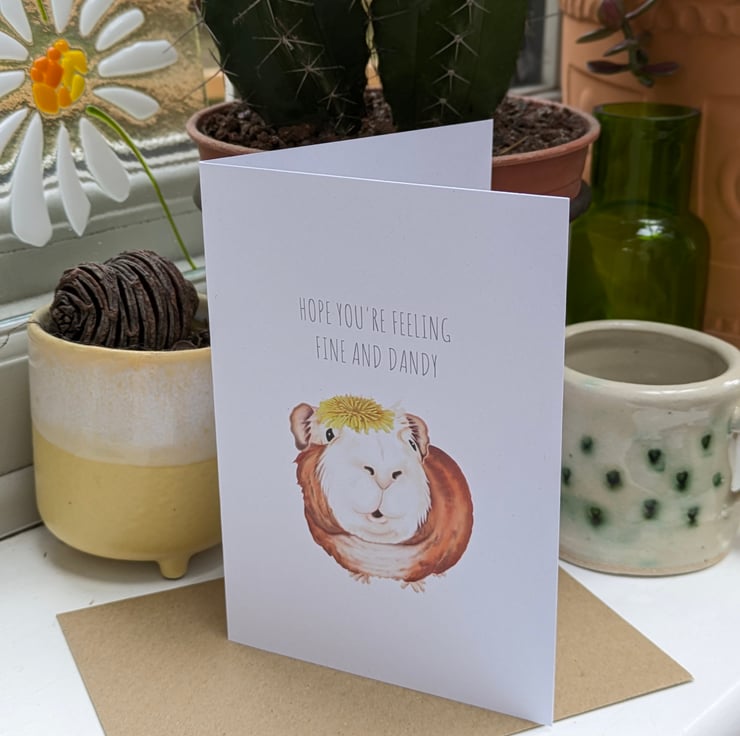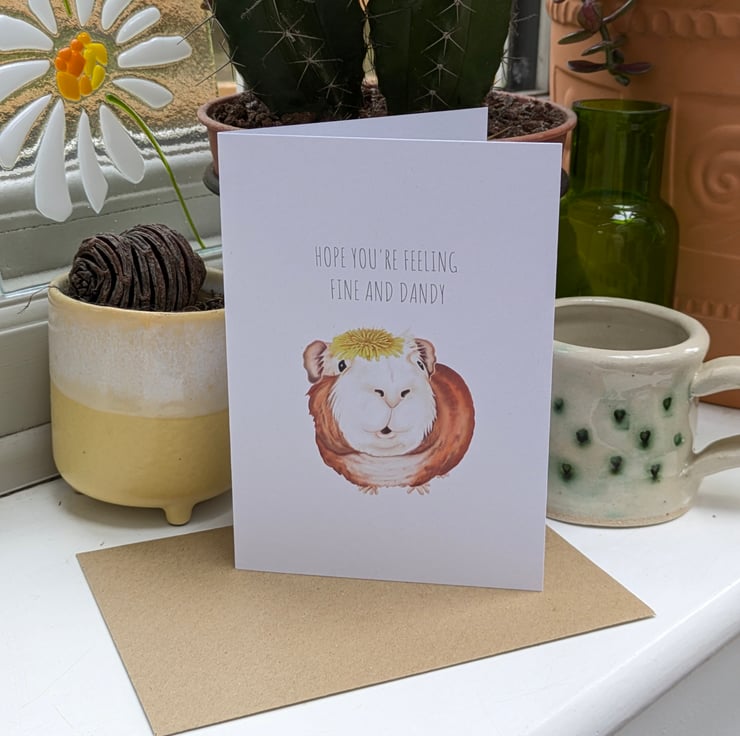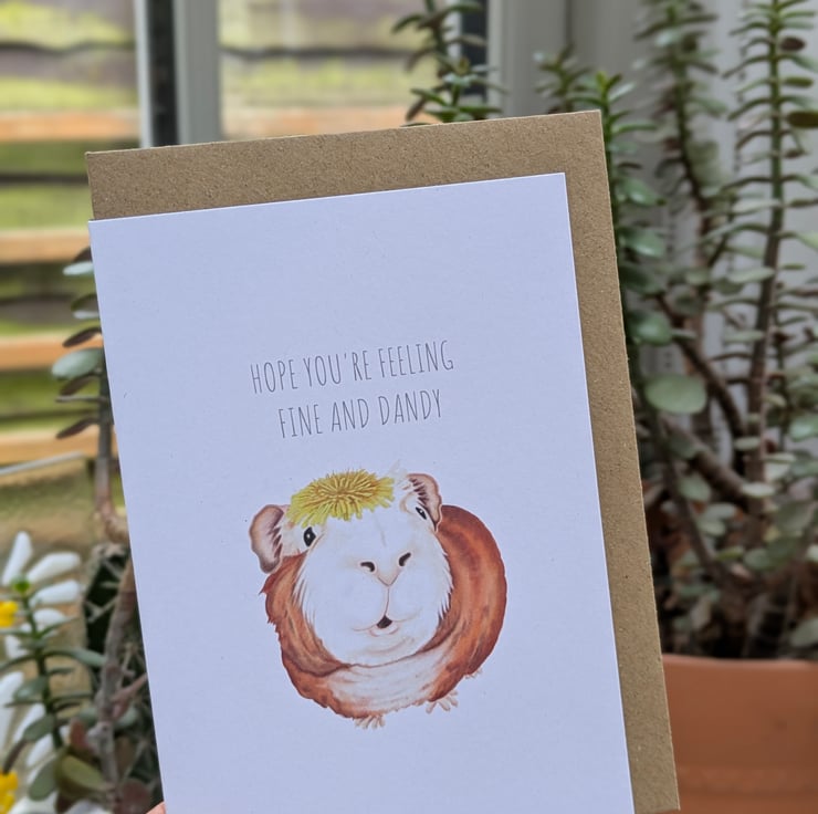 Haven't checked on a friend in a while? Think they might be having a tough time or just want to say hello again? This sweet guinea pig is wearing it's dandelion hat and is the perfect way to get in touch and raise a smile from your friend or loved one.