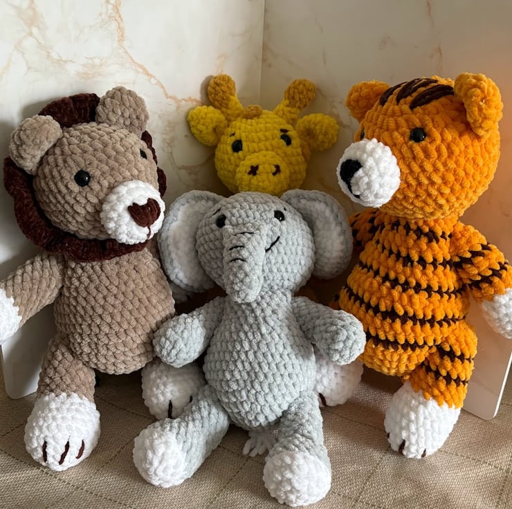 The collection features Len the Lion, Geraldine the Giraffe, Evelyn the Elephant, and Tom the Tiger.