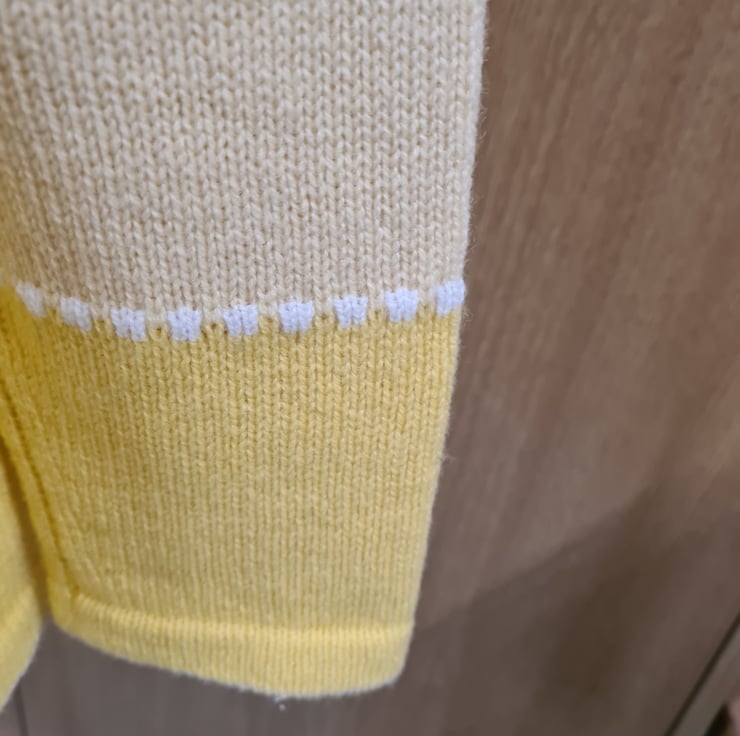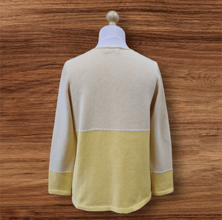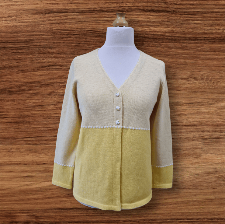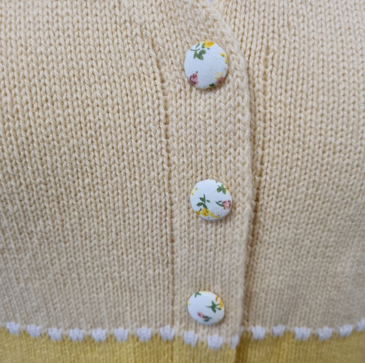 A long sleeve lambswool cardigan knitted in daffodil and primrose yellow with white stitch detail and fabric covered buttons. Slightly fitted design.