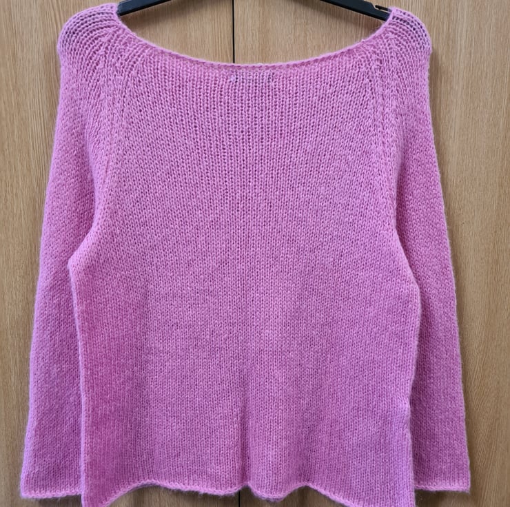 A peony pink mohair jumper, relaxed style with a wide neck. Perfect for summer evenings. 1 medium(12-14) and 1 large(16-18)