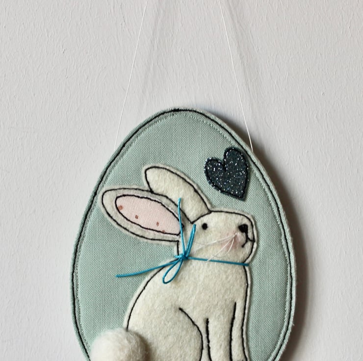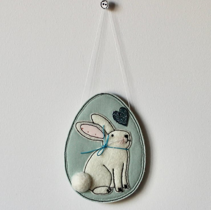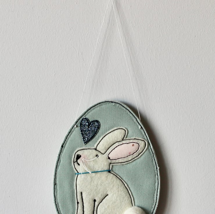 Each egg is sewn using 100% wool felt, cotton cloth, glitter cloth and free hand machine embroidery; multiple layers of cloth are sewn together and cut out by hand using very sharp scissors. With a handmade wool felt ball tail and a linen string to suspend.