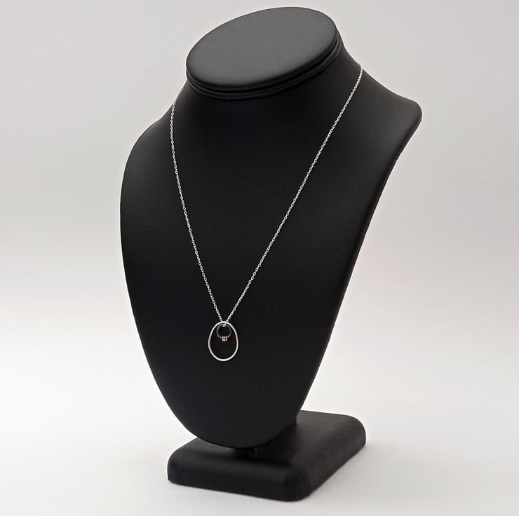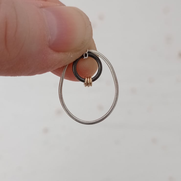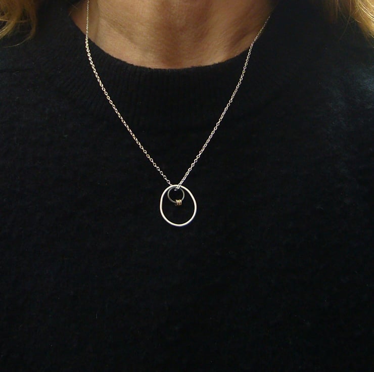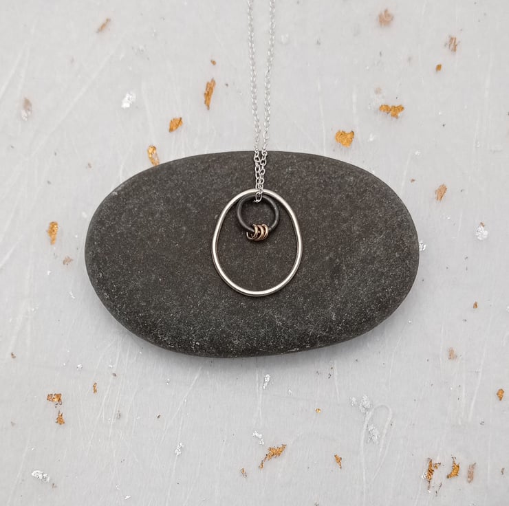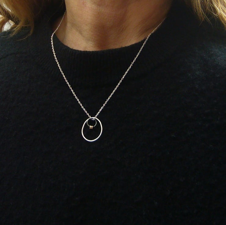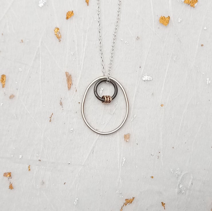 I have created this necklace by shaping recycled sterling silver wire by hand. After soldering & finishing the wire, I attached an oxidised silver ring and 3 filled gold jump rings to give some contrast on the necklace. To finish, the pieces hang on an 18” sterling silver chain. (The filled gold jump rings have been created by mechanically bonding a layer of 14ct gold to a layer of base metal).