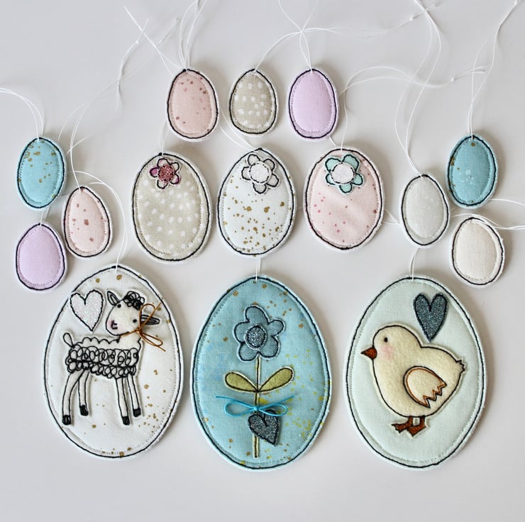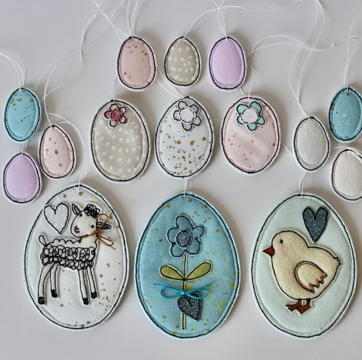 Each egg is sewn using 100% wool felt, cotton cloth, glitter cloth and free hand machine embroidery; multiple layers of cloth are sewn together and cut out by hand using very sharp scissors. With a linen string to suspend.