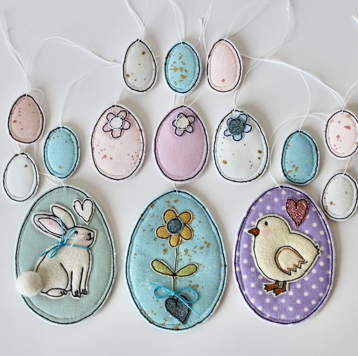 Each egg is sewn using 100% wool felt, cotton cloth, glitter cloth and free hand machine embroidery; multiple layers of cloth are sewn together and cut out by hand using very sharp scissors. With a linen string to suspend.