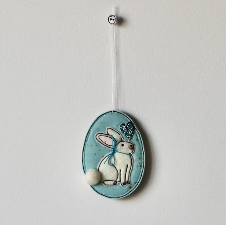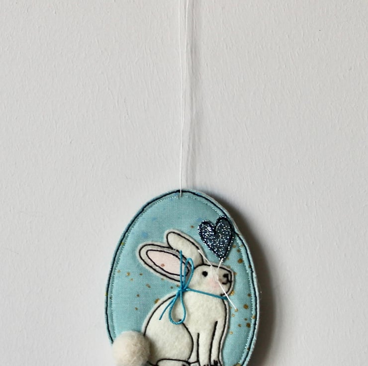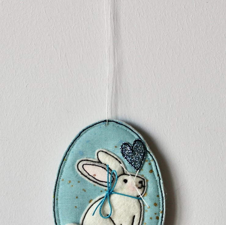 'Bunny on a Blue Egg with a Blue Glitter Heart 10' - Hanging Decoration