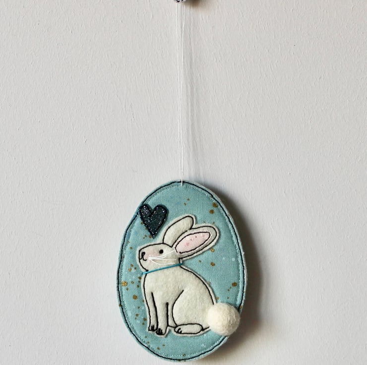 Each egg is sewn using 100% wool felt, cotton cloth, glitter cloth and free hand machine embroidery; multiple layers of cloth are sewn together and cut out by hand using very sharp scissors. With a handmade wool felt ball tail and a linen string to suspend.