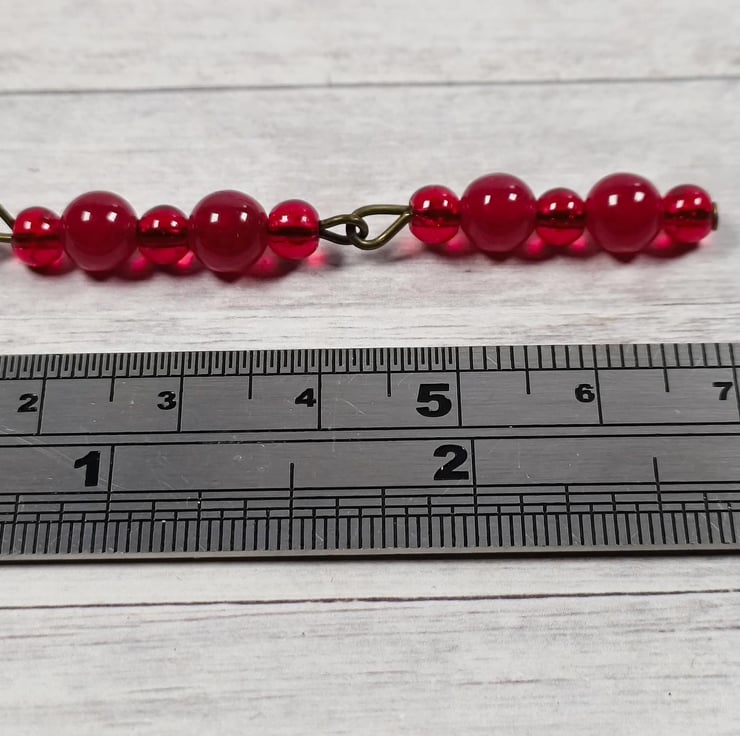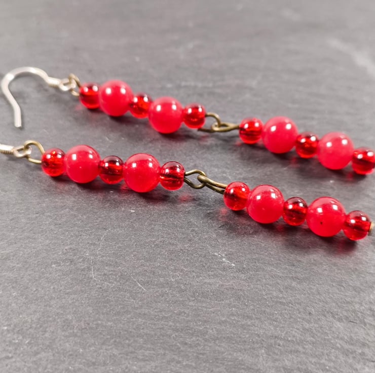 Pretty ruby red lustre beads teamed with red glass crackle beads on antique bronze wires and hooks, elegant and classy.