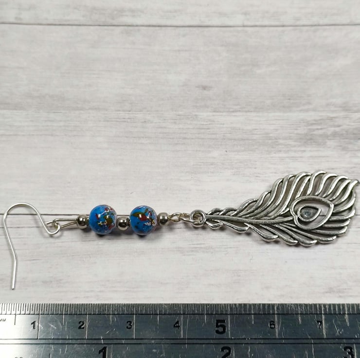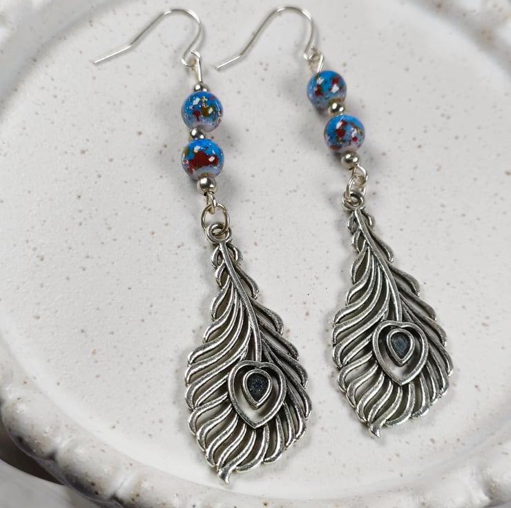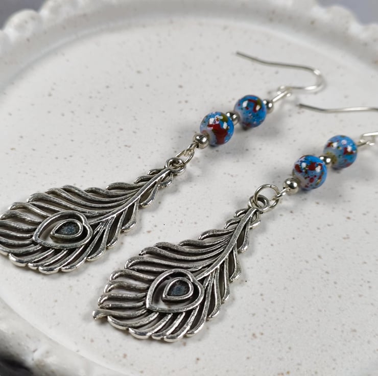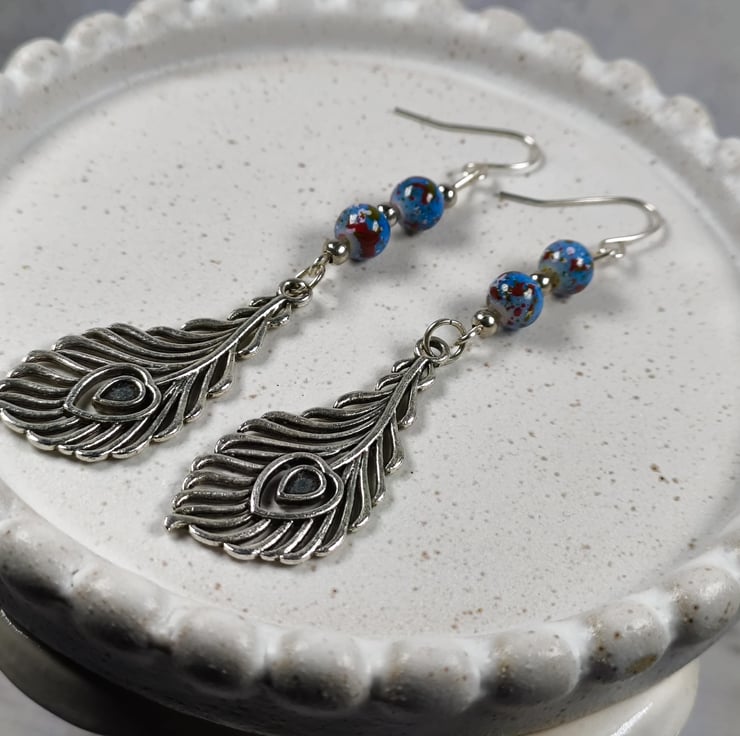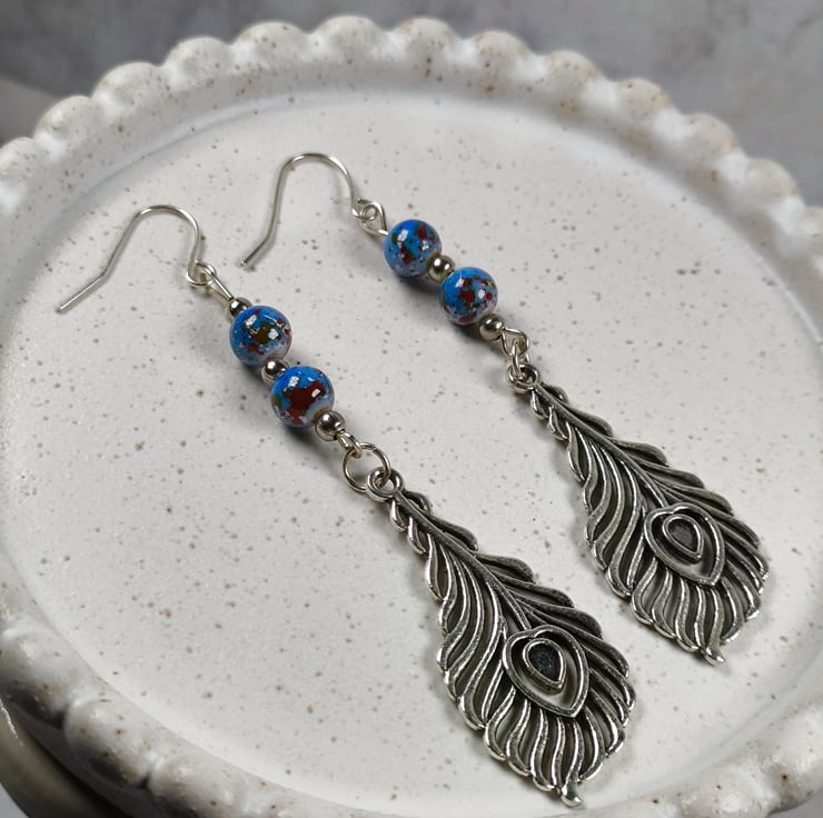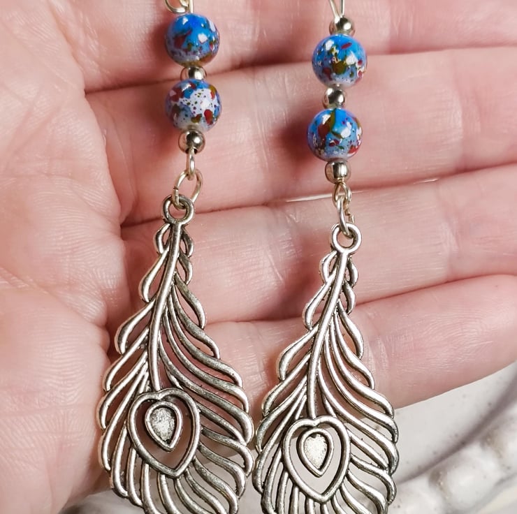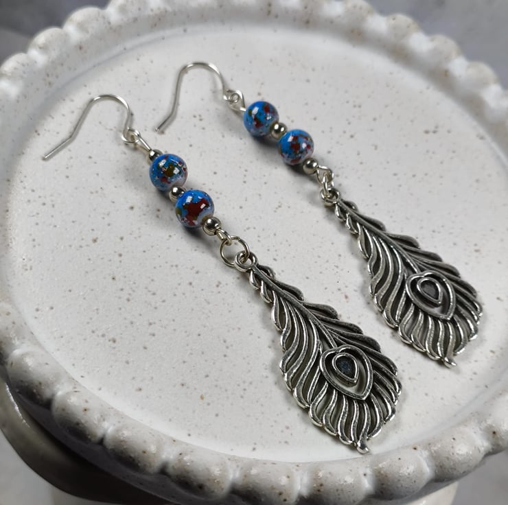 These beautiful earrings are made from stunning, long silver tone peacock feather charms, I've added pretty blue swirls beads on French ear hooks in silver plate.