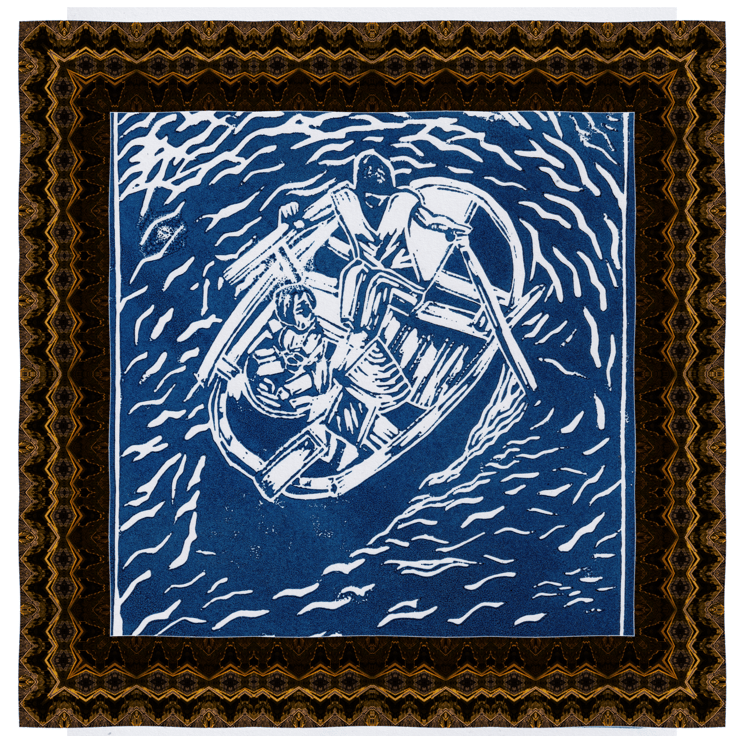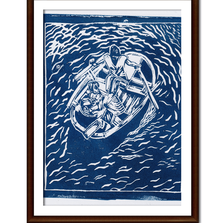 Capture the peaceful life in Vietnam with this Handcrafted Lino Cut Print of a lady rowing a boat with her child and load of snacks. Created with blue ink on white card, this stunning unframed artwork showcases the serene beauty of everyday life on the water. . Measuring 14.8 cm x 21 cm, this lino cut print is a timeless piece of art that will transport you to a tranquil river scene.