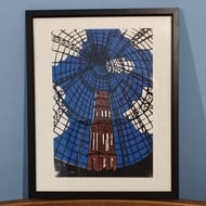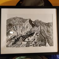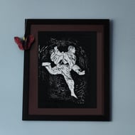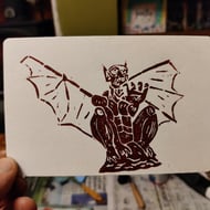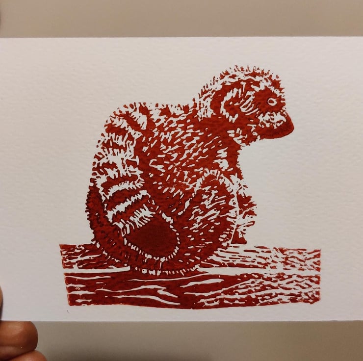 Handcrafted Lino Cut Print created with red ink on cream card. . Measuring 14.8 cm x 9.8 cm.