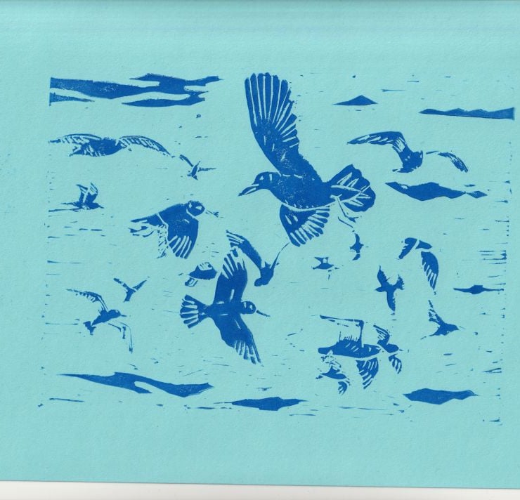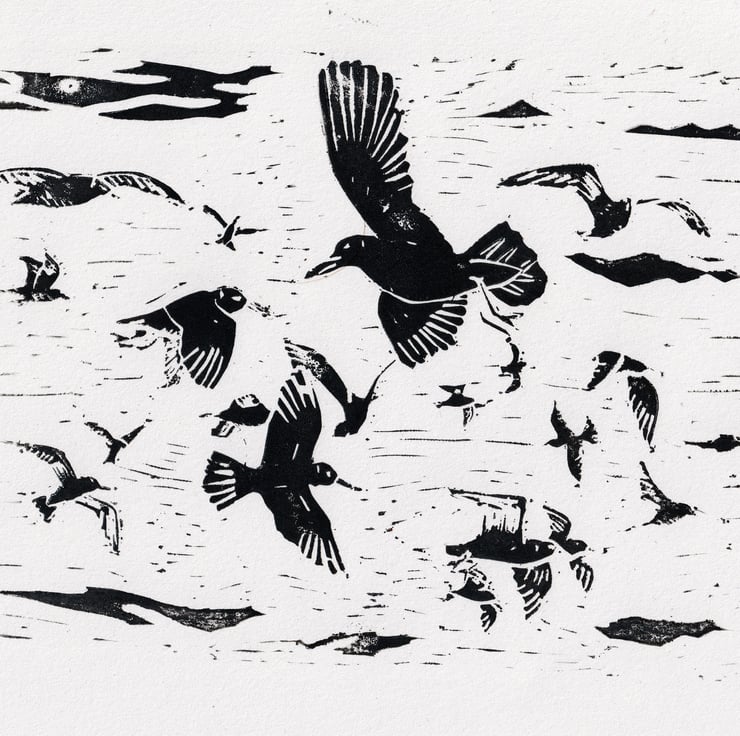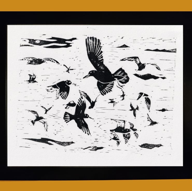 Handcrafted lino cut print of seagulls flying in a flock. Beautiful picture of a beautiful day. Suitable for any bird or wild life lover.