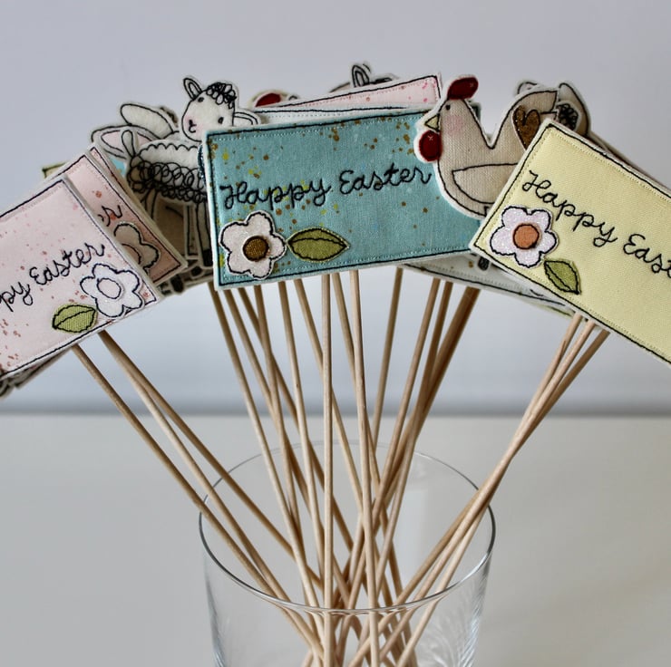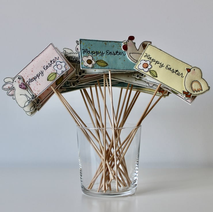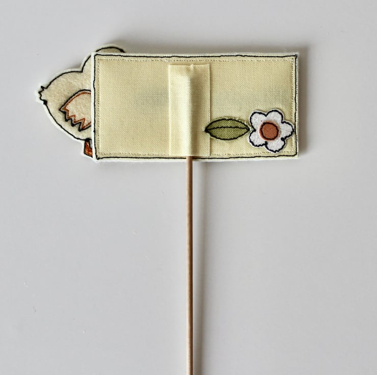 These handmade labels are sewn using 100% wool felt, cotton cloth, glitter cloth and free hand machine embroidery; multiple layers of cloth are sewn together and cut out by hand using sharp scissors. Each is mounted on a 20cm dowel making them easy to place into the cake, blooms or gift.