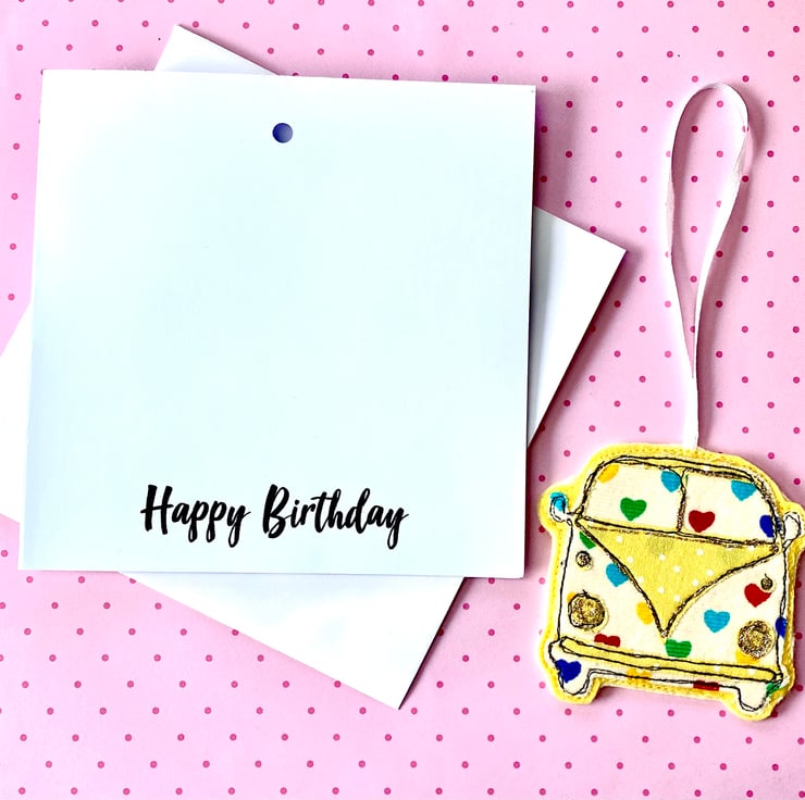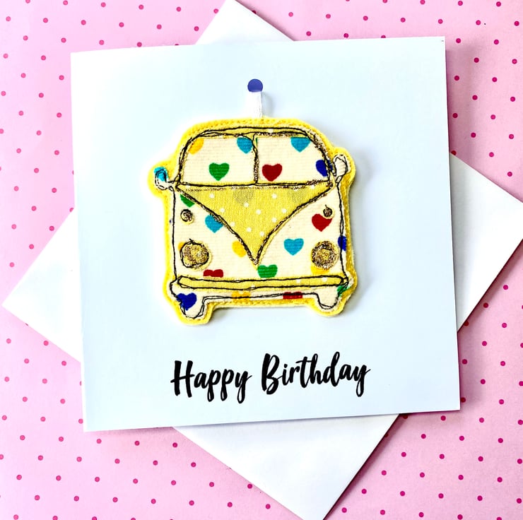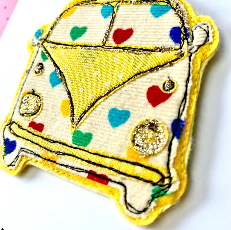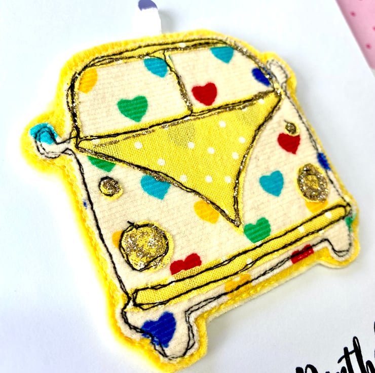 This is a great keepsake card for anyone who loves campervans or who loves to travel. This handmade card has been made using layers of brightly coloured fabric and felt. It has been stitched together using freemotion embroidery. Added accents of glitter have been added for that extra bit of sparkle. It has a detactchable hanging decoration on the front of the card which makes a great gift that can be hung in your home or even in your Campervan.