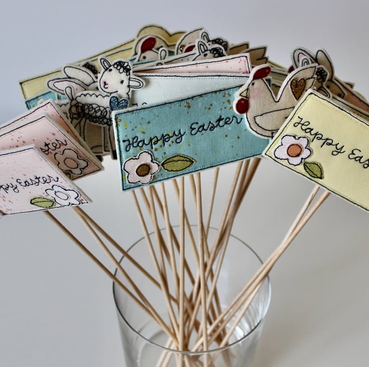 These handmade labels are sewn using 100% wool felt, cotton cloth, glitter cloth and free hand machine embroidery; multiple layers of cloth are sewn together and cut out by hand using sharp scissors. Each is mounted on a 20cm dowel making them easy to place into the cake, blooms or gift.