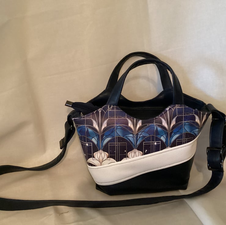 This cute bag is small but roomy. It is made from contrasting vinyl panels and features an external zip pocket, an internal slip pocket and adjustable strap. It has a top zip closure and two carrying handles.