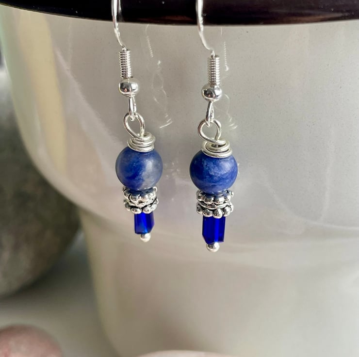 Do you like Petite, drop, and lightweight earrings? You do...... take a look at these. One-of-a-kind earrings made using deep Blue Austria cuboid crystal teamed with a pretty pale Blue Natural Sodalite bead with components made from Stainless Steel and to finish Sterling Silver ear fittings.
