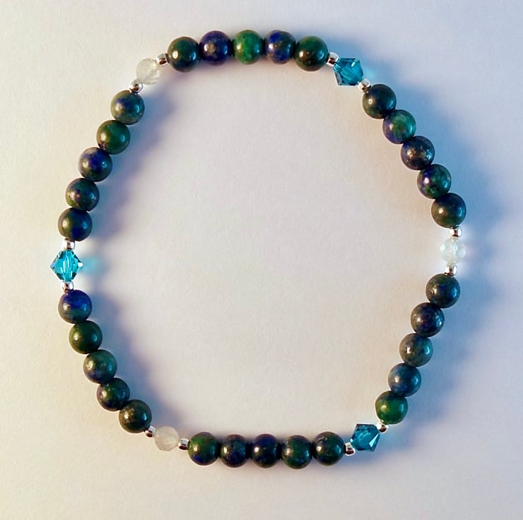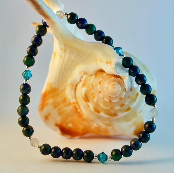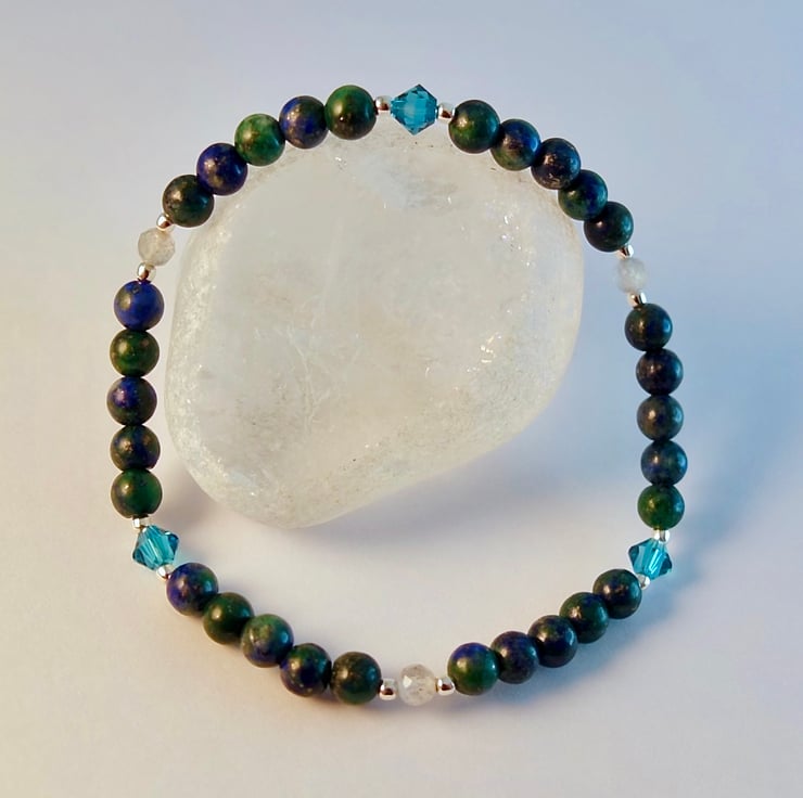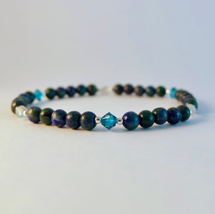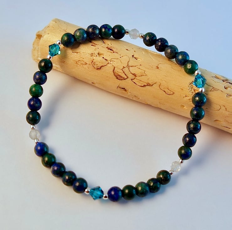 Dark green and deep blue 4mm Chrysocolla beads embellished with sparkly Austrian crystals in the colour 'indicolite', faceted Labradorite and tiny sterling silver spacer beads.